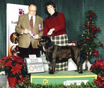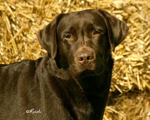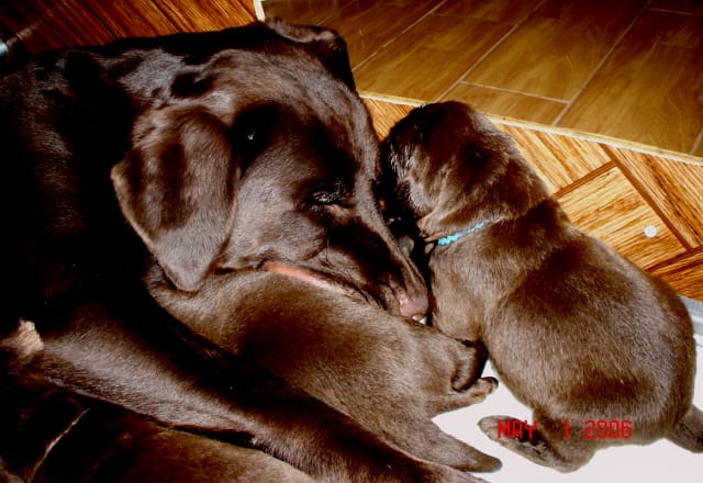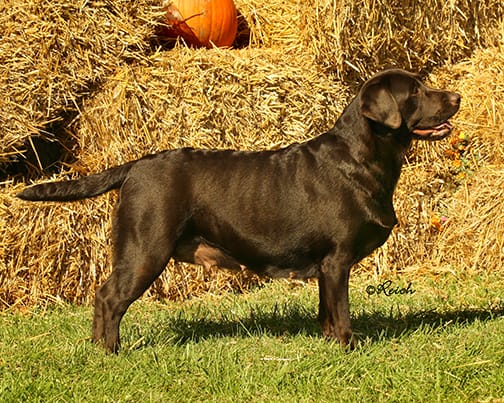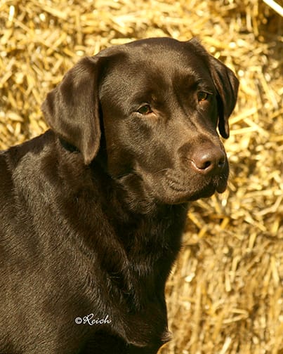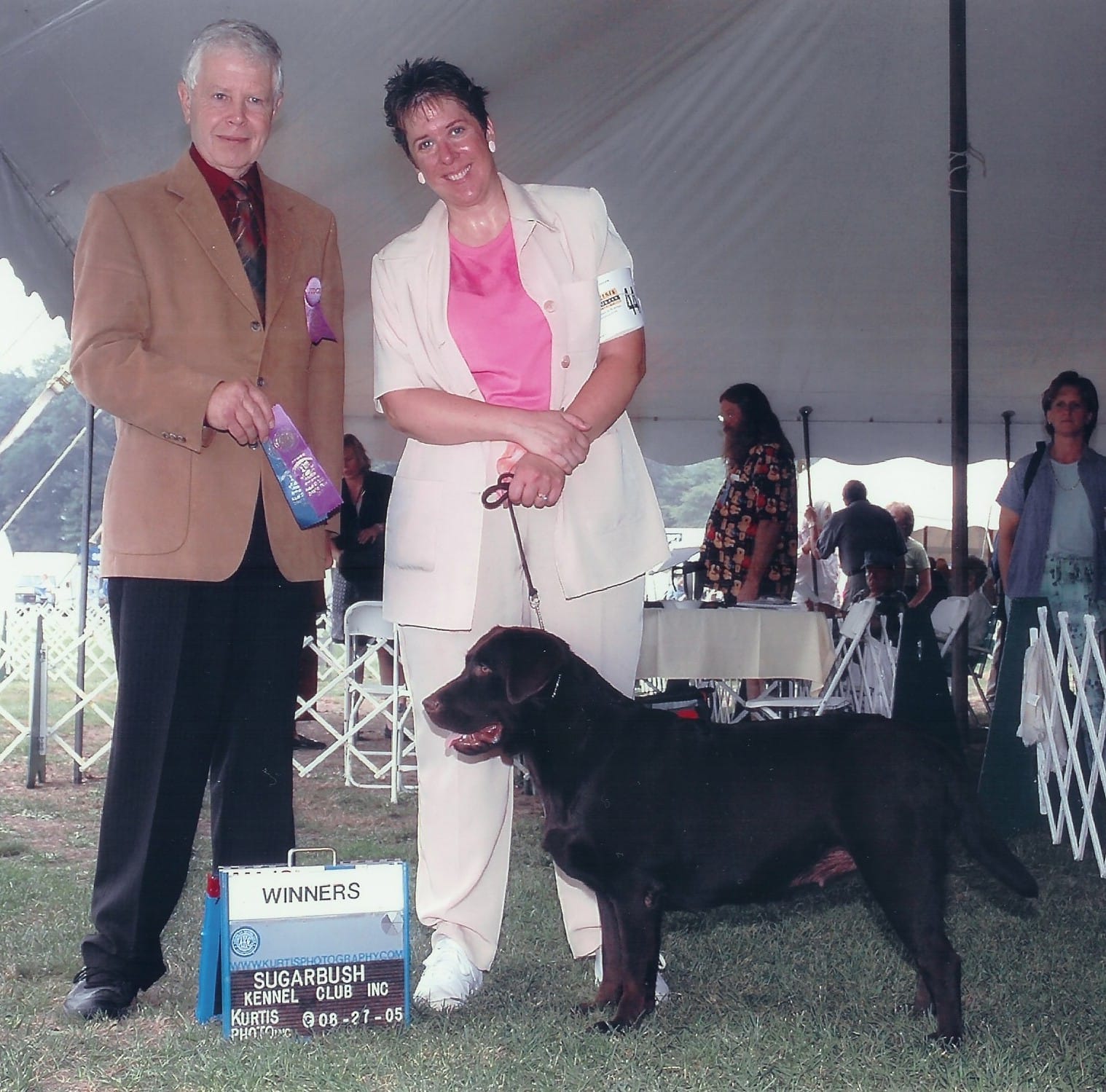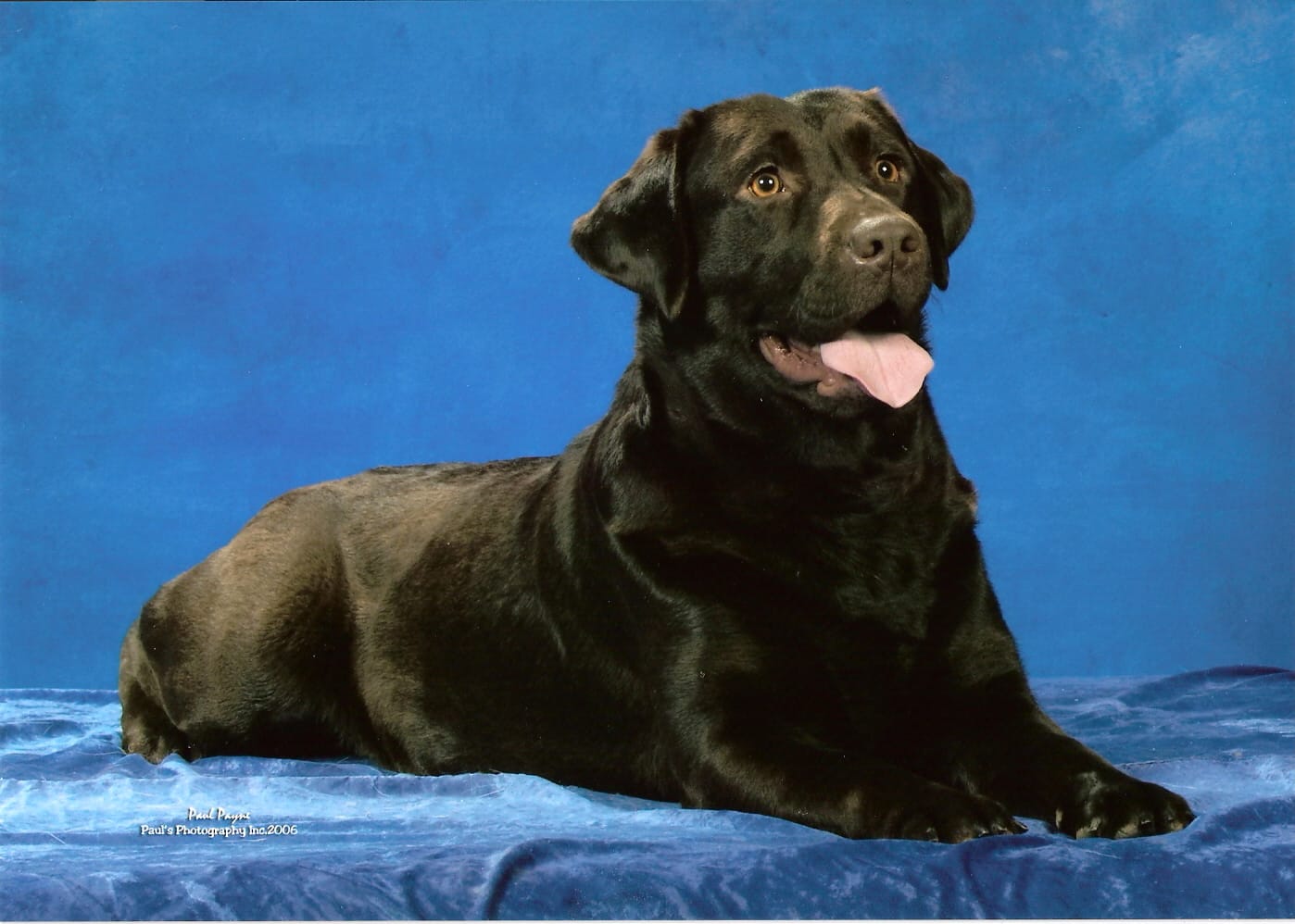 Bella was our foundation chocolate bitch and all of our chocolates go back to her. Actually some of our yellows go back to her which is something we learned when we bred Bella’s daughter Marie to a boy that was black and carried chocolate & yellow. Both yellows in that litter had lovely black pigment. Color testing was not common back then.